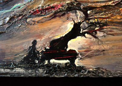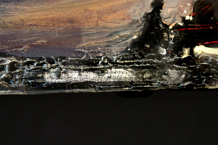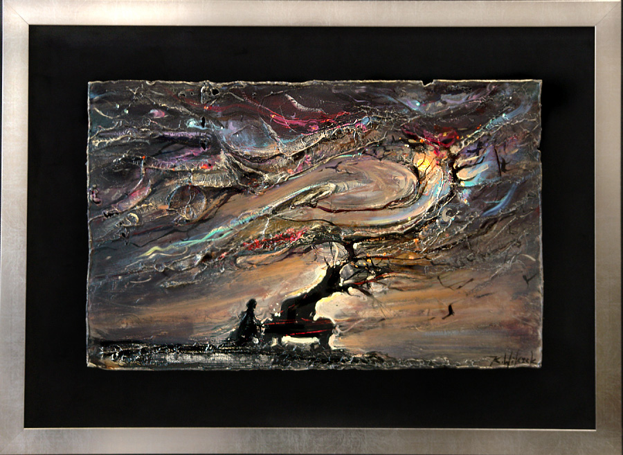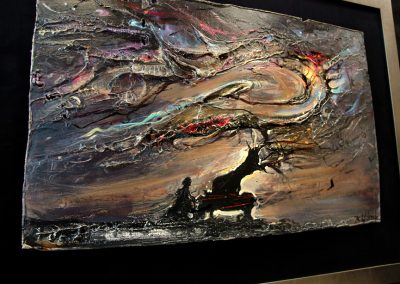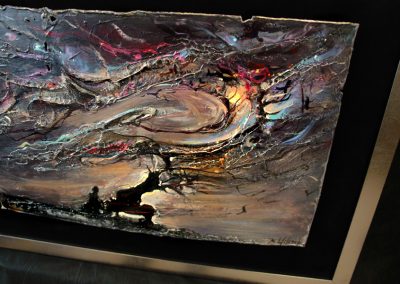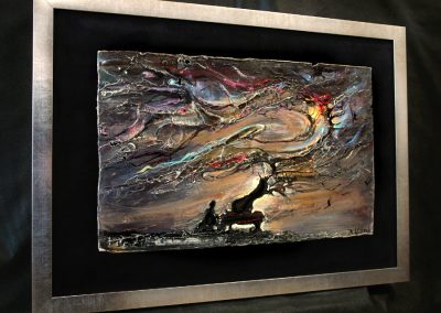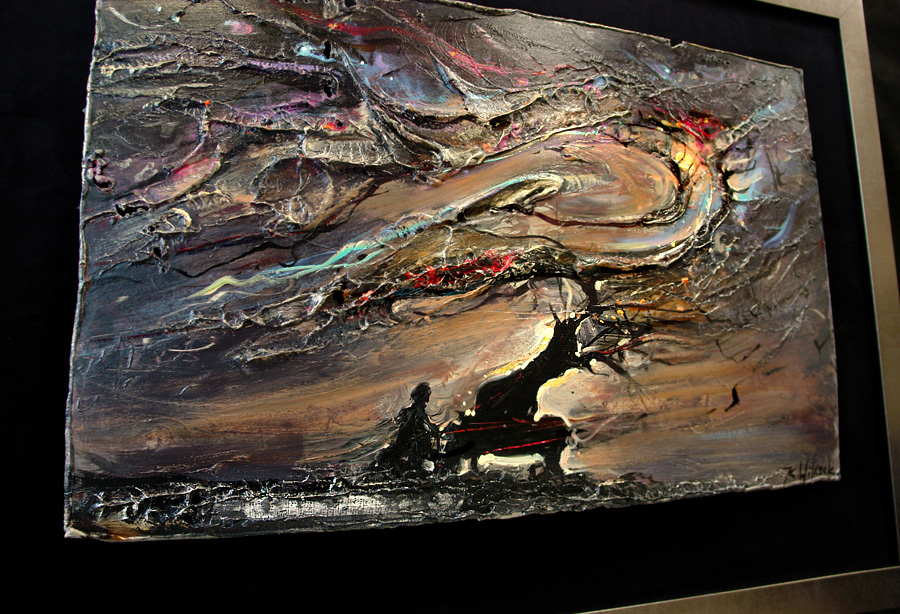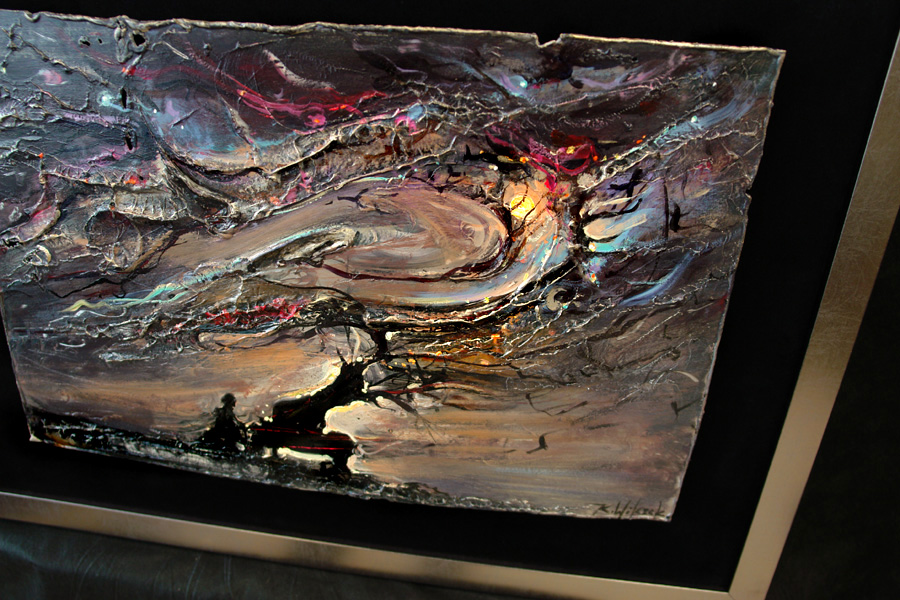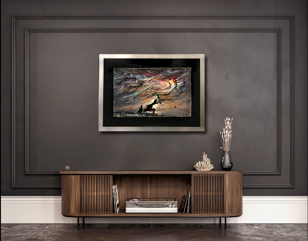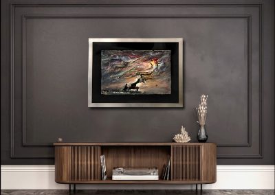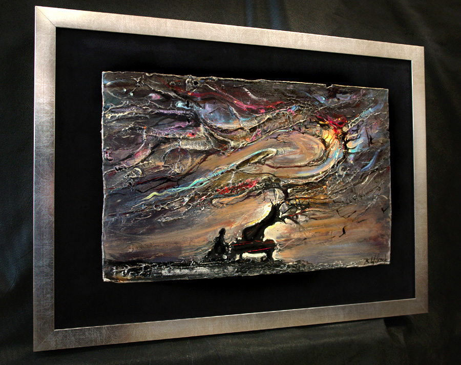 • obraz eksponowany na czarnym askamicie , oprawiony w metaliczną ramę.
