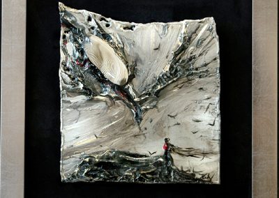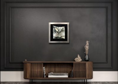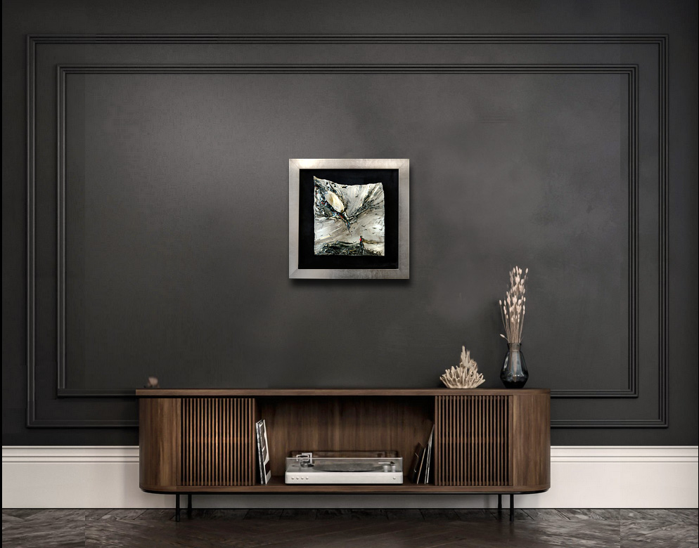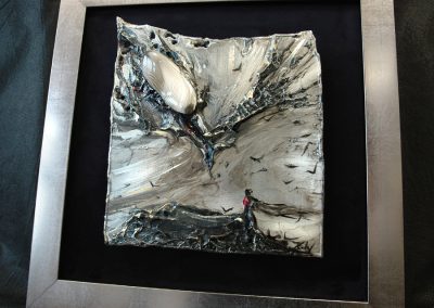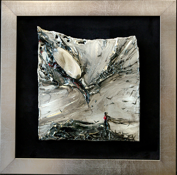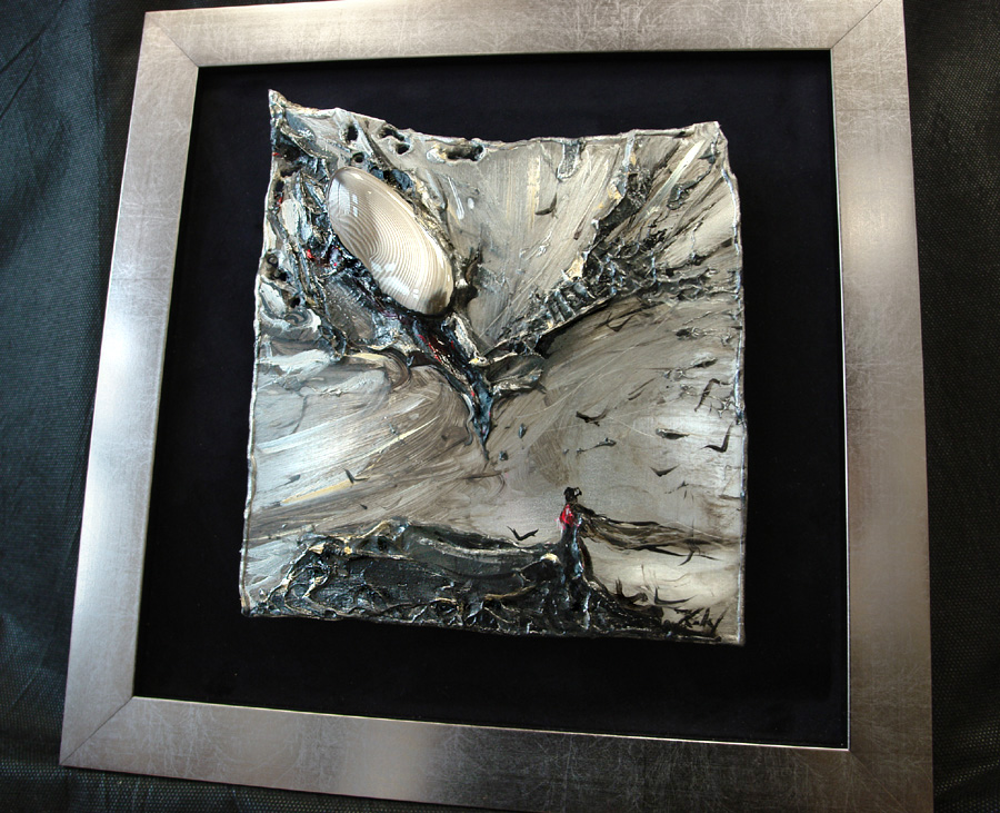 - obraz eksponowany na czarnym askamicie , oprawiony w metaliczną ramę.